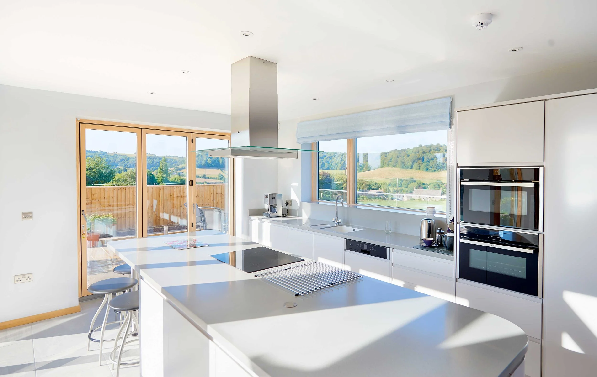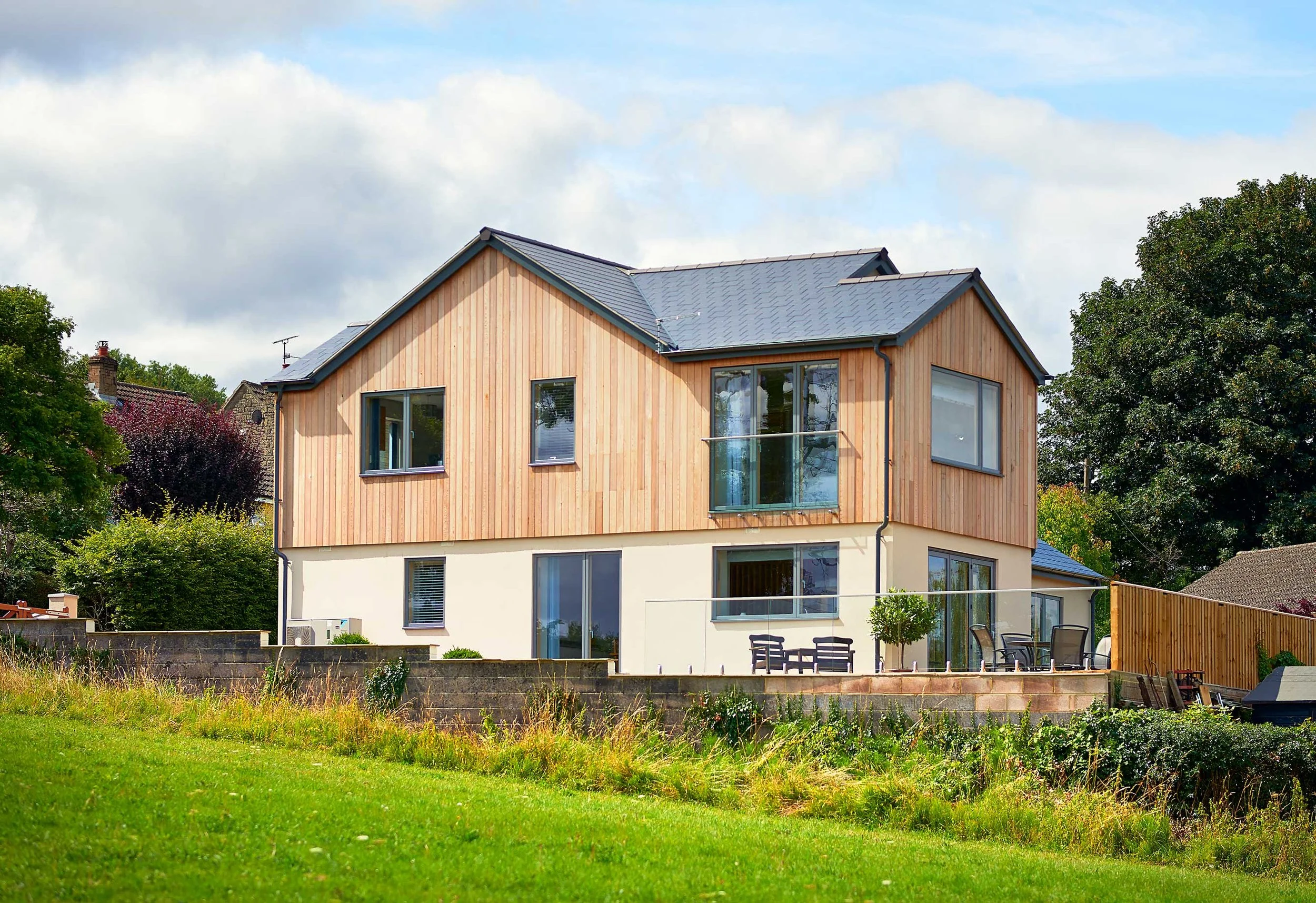 Solar panels on the garage harvest electricity, which serve to power the air source heat pump which, in conjunction with solar-thermal panels on the roof, provide heating and hot water. Well-insulated, and with good air-tightness, the house is comfortable and efficient to run year-round.