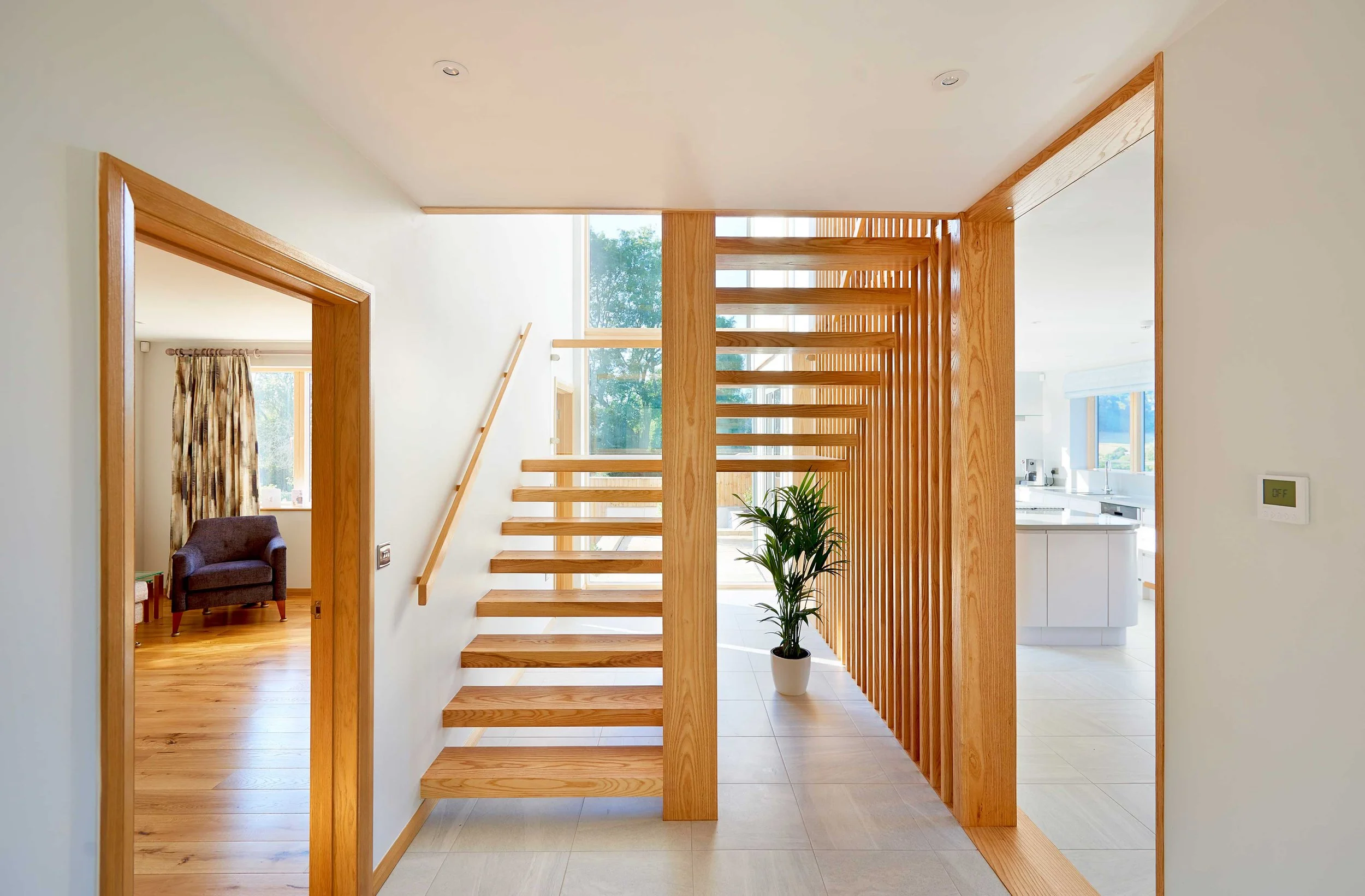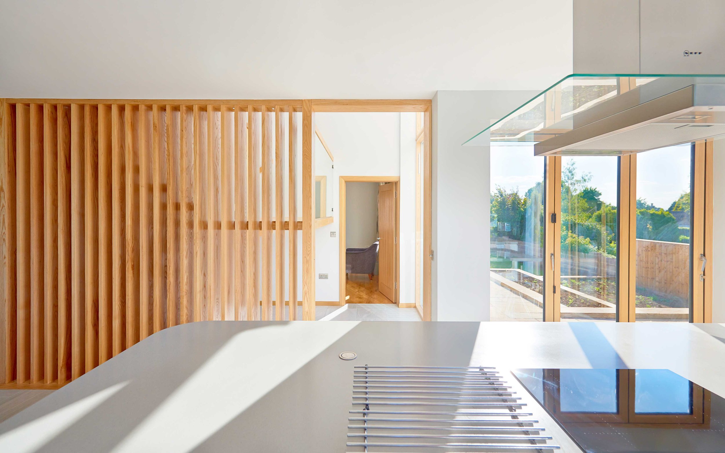 Following a review of the potential to transform the existing house, the decision to replace offered a chance to achieve a high-quality building whilst saving VAT; a value-led choice many self-builders face. The design has reminiscence of the building it replaces, helping it fit in with neighbours, whilst celebrating differences which stand out. Combining crisp cedar cladding over white render, the house is both modern and timeless in its appearance, standing proudly without shouting loud. Its statement feature, however, is inside - a stunning staircase in the heart of the house, beautifully made in ash by a local artisan joiner, this forms a focal point which connects the open-plan ground floor rooms as well as bringing light through the centre of the house.