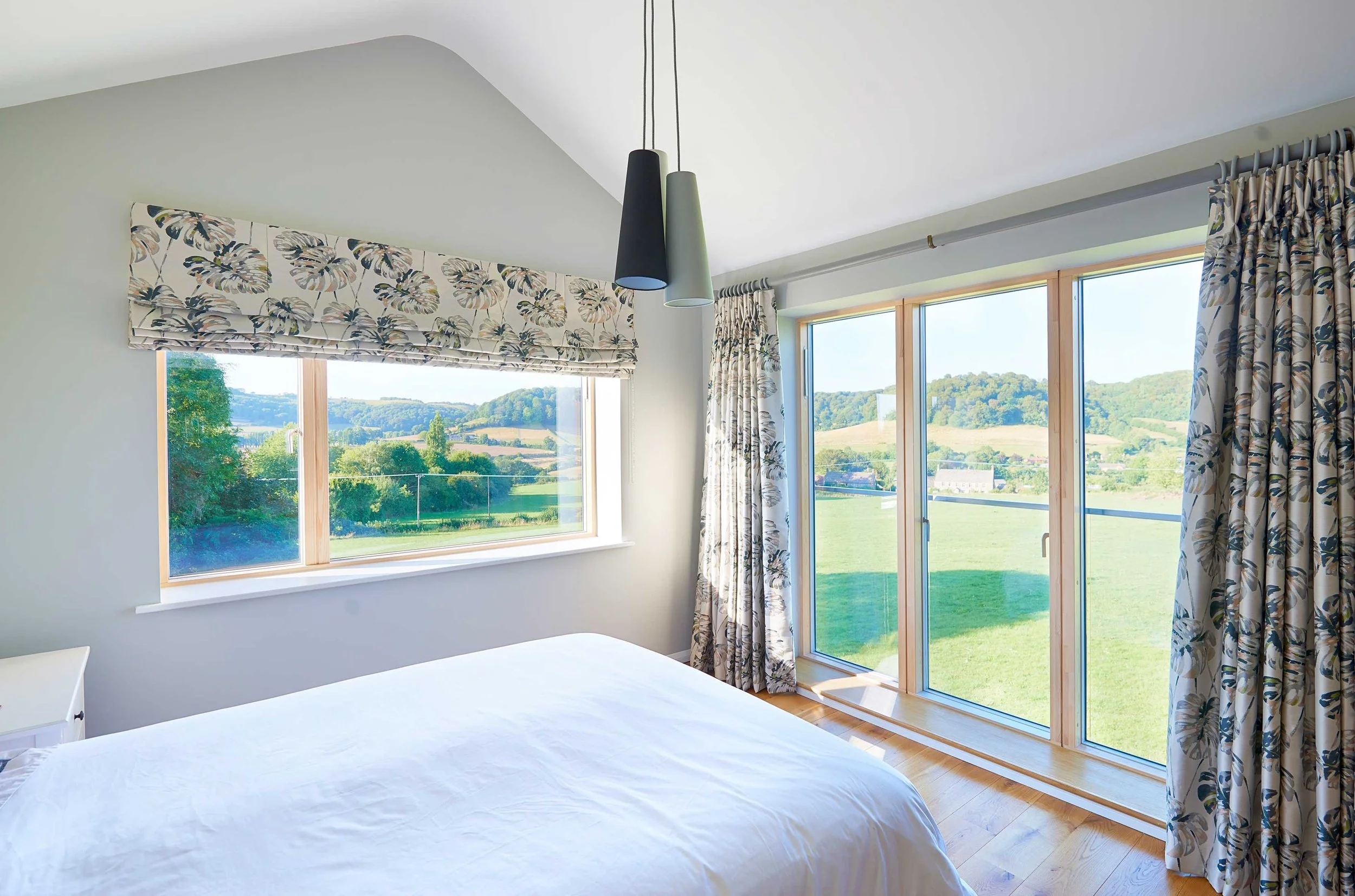 Upstairs, the master bedroom enjoys the stunning views across fields to the wooded hillside beyond. Sliding doors onto a Juliet balcony open the bedroom out into the landscape beyond.