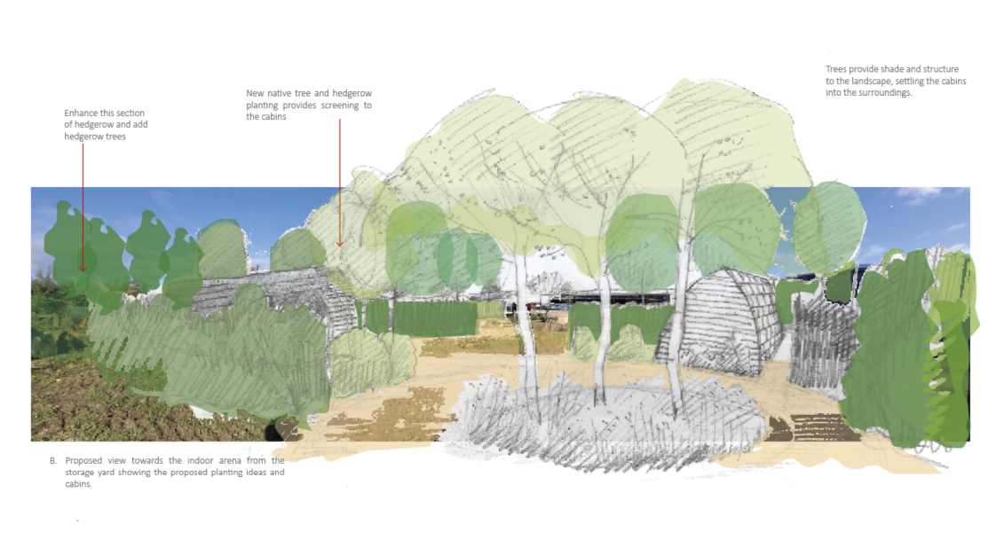 An avenue of new trees is also proposed along the central track, helping to replace ash trees that are currently in decline in the surrounding hedgerows. In time, these trees will provide welcome shade for horses and further enrich the visual character of the site.