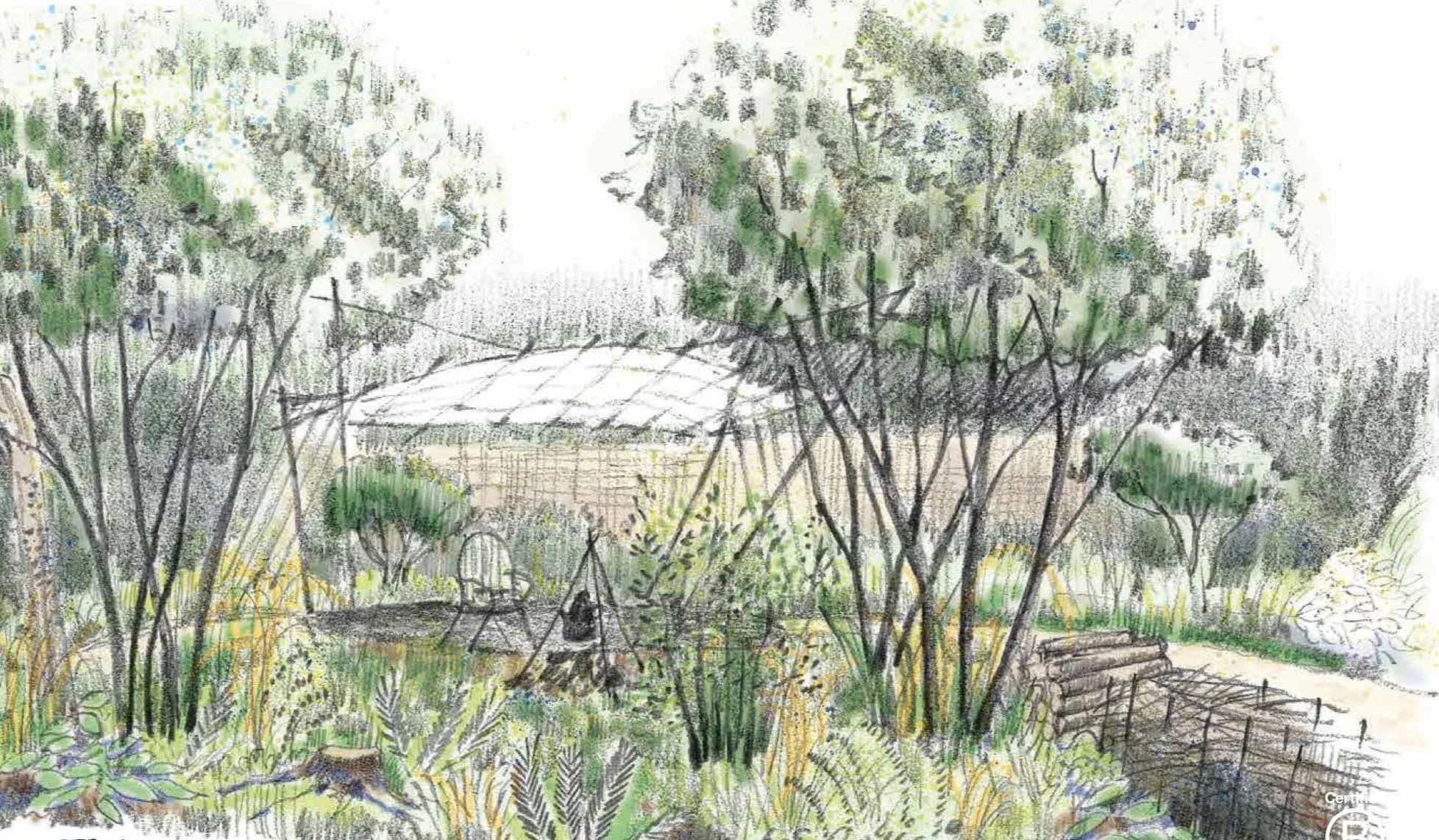Rachael’s design draws on the distinctive character of the valleys surrounding Ruskin Mill College in Nailsworth, Gloucestershire. Interpreting the woodland edge as a rich, layered environment, the garden weaves together coppiced hazel, open glades, and productive planting to create a space that is both ecologically grounded and educationally purposeful.
